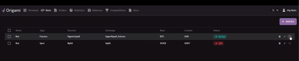 If you ever want to stop your bot, simply click the Power icon again and all activity will pause. You can always adjust your bot settings to reflect current market conditions, and Origami Tech makes it easy to test and adapt on the fly.