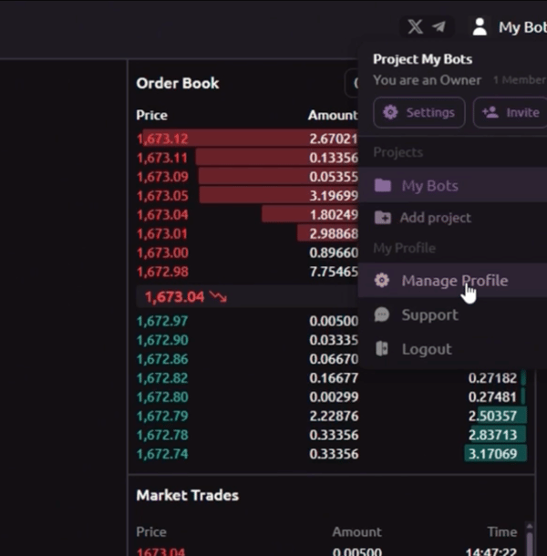 After logging in, create a new project. This is a unique workspace where you can manage exchange accounts and strategies together. - Open your project in Origami Tech Go to Manage Profile